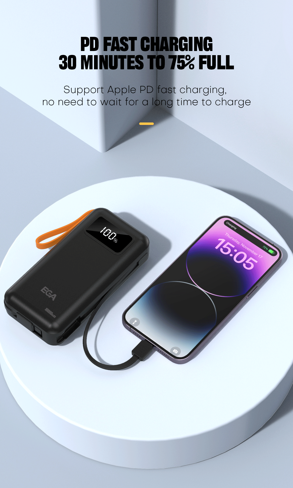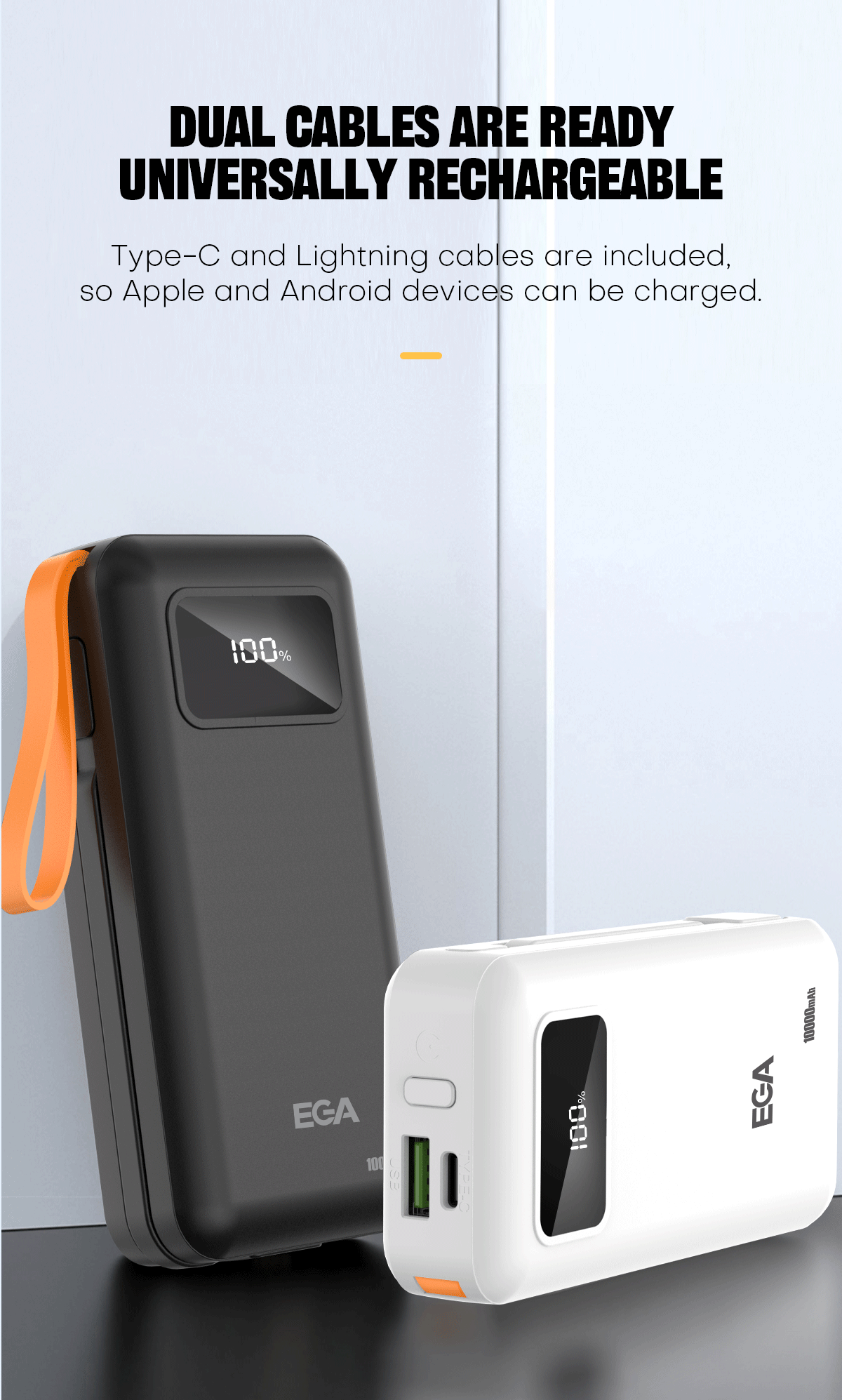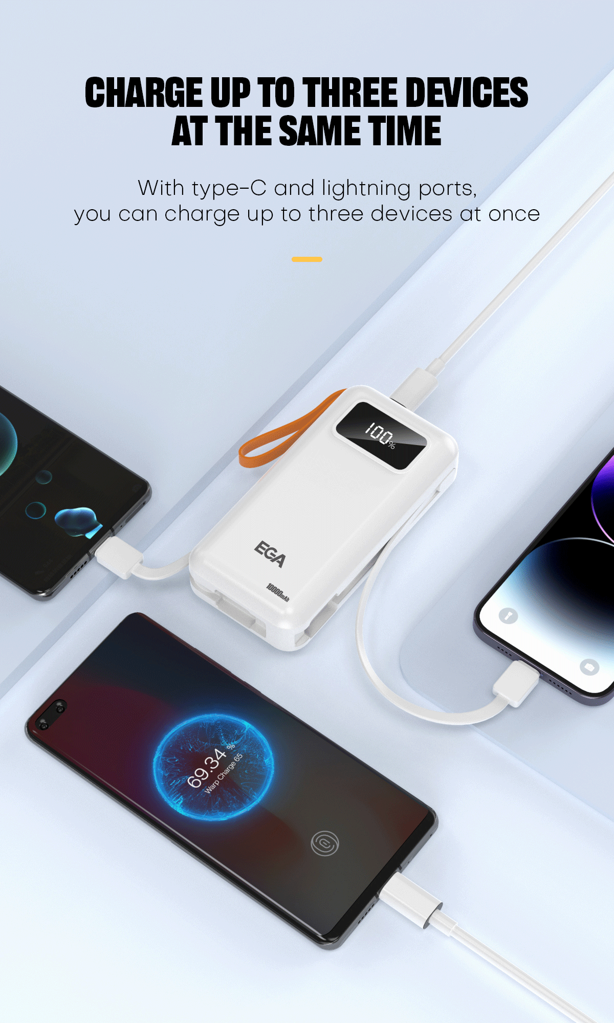 V těle power banky jsou odpojitelné kabely pro nabíjení zařízení přes USB-C či přes Lightning. Odpadá hledání nabíjecích kabelů.