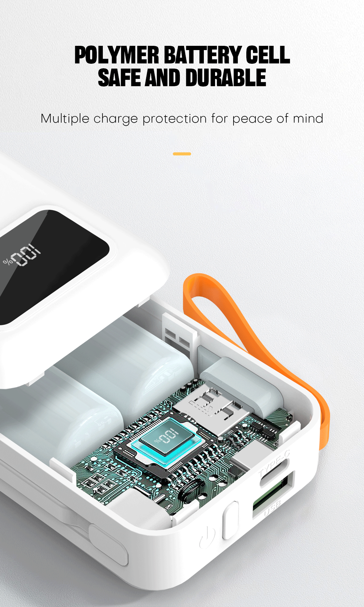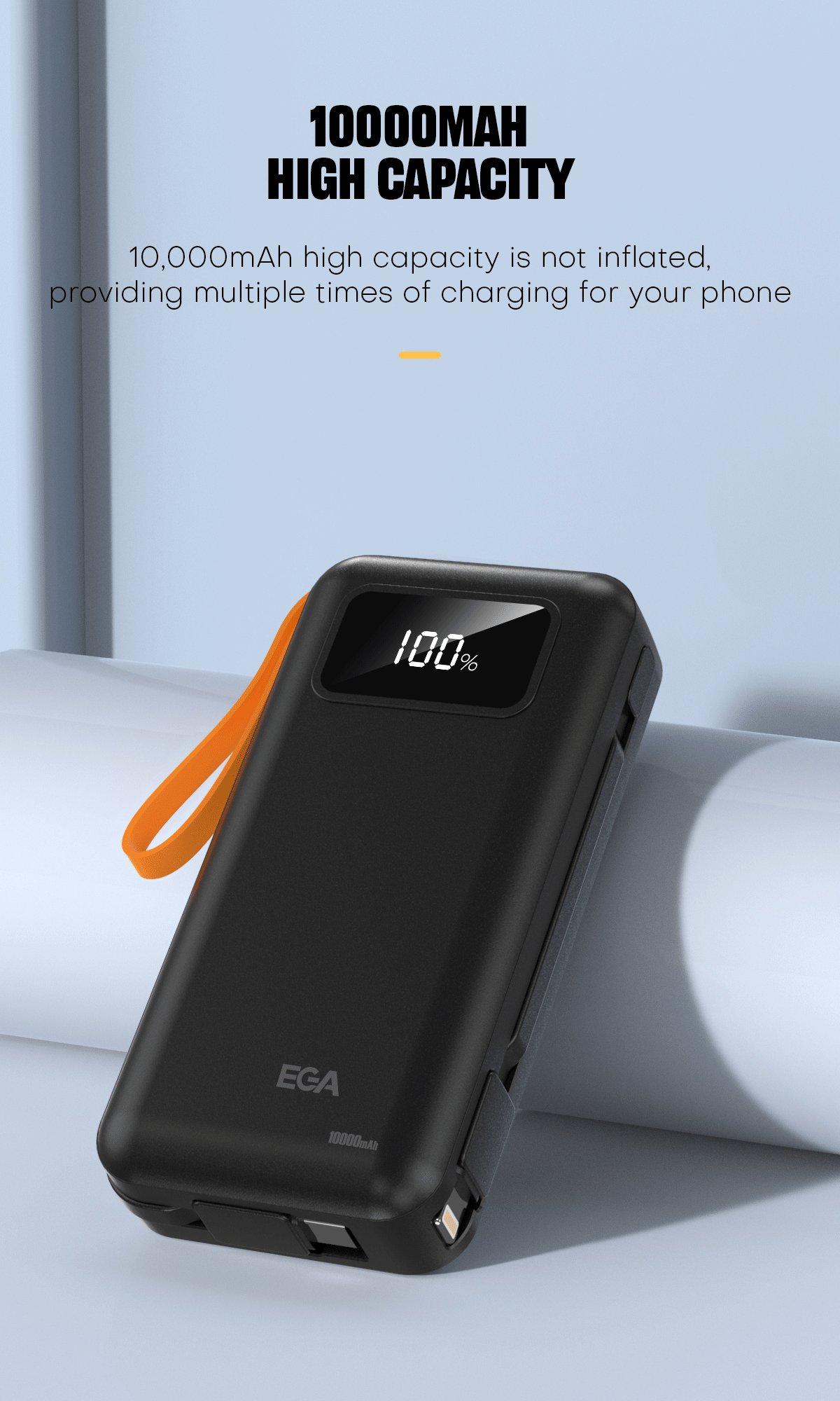Kompaktní a elegantní power banka o kapacitě 10 000 mAh s integrovaným displejem ukazující aktuální nabití power banky.