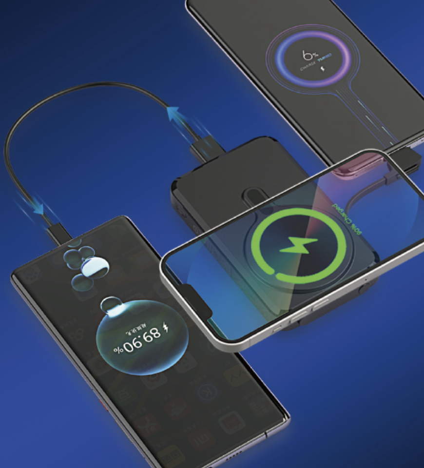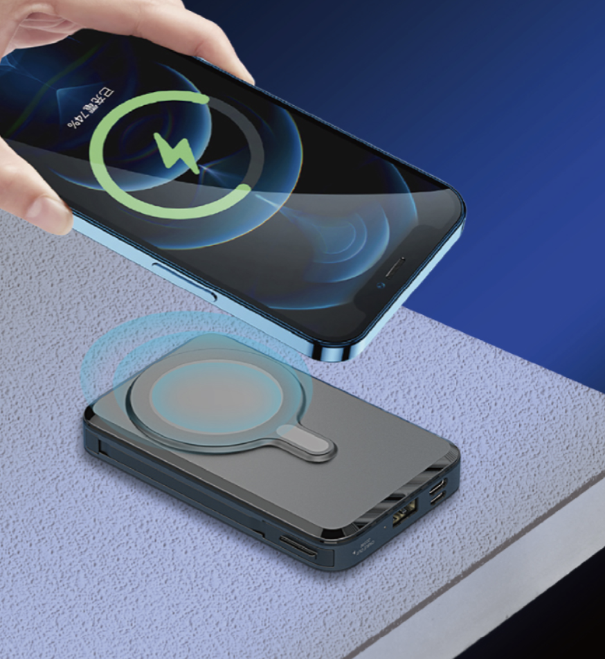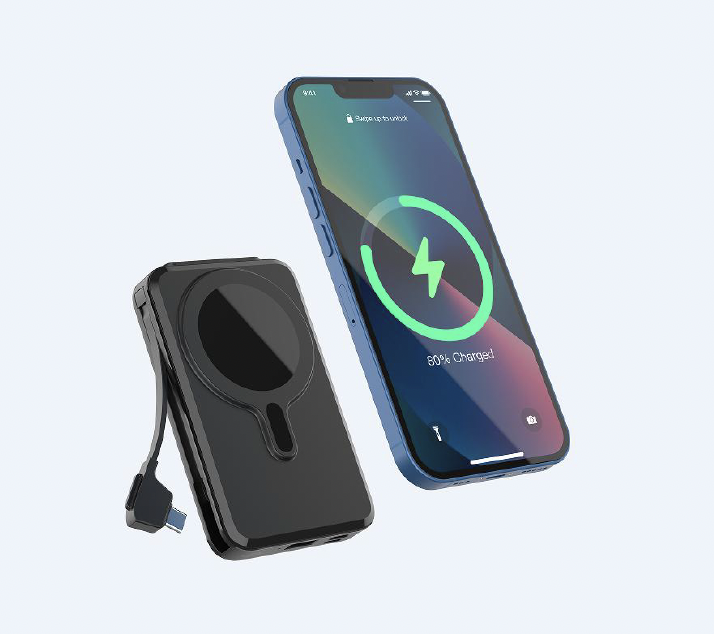 Power banka se zabudovaným bezdrátovým nabíjením MagSafe (MagSafe pouze pro iPhone 12 a vyšší modely) a zabudovaným USB-C kabelem.